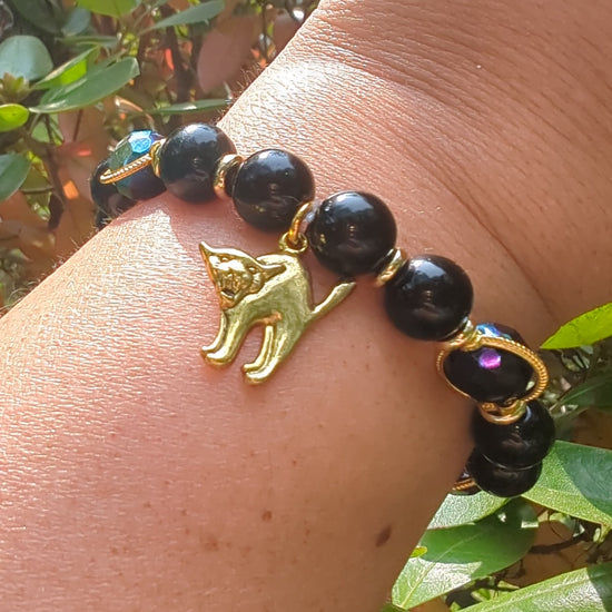 Sleek and mysterious, Shadow’s Prowl captures the essence of Halloween’s most iconic omen—the black cat. Deep, glossy beads accented with shimmering faceted crystals reflect the glow of moonlight, while golden details add a touch of elegance. At the center, a golden black cat charm arches in classic Halloween fashion, symbolizing mystery, luck, and a little spooky mischief.