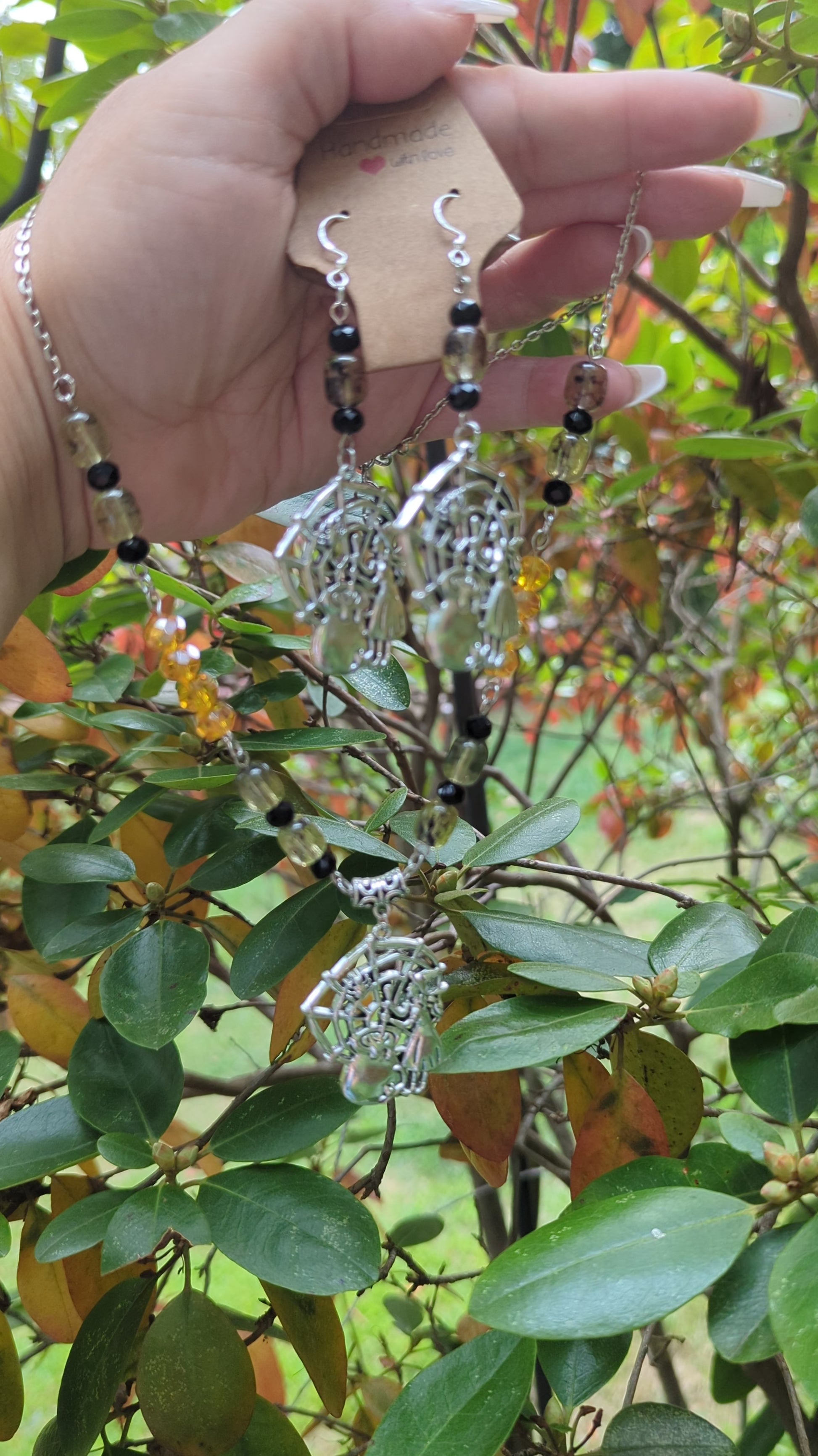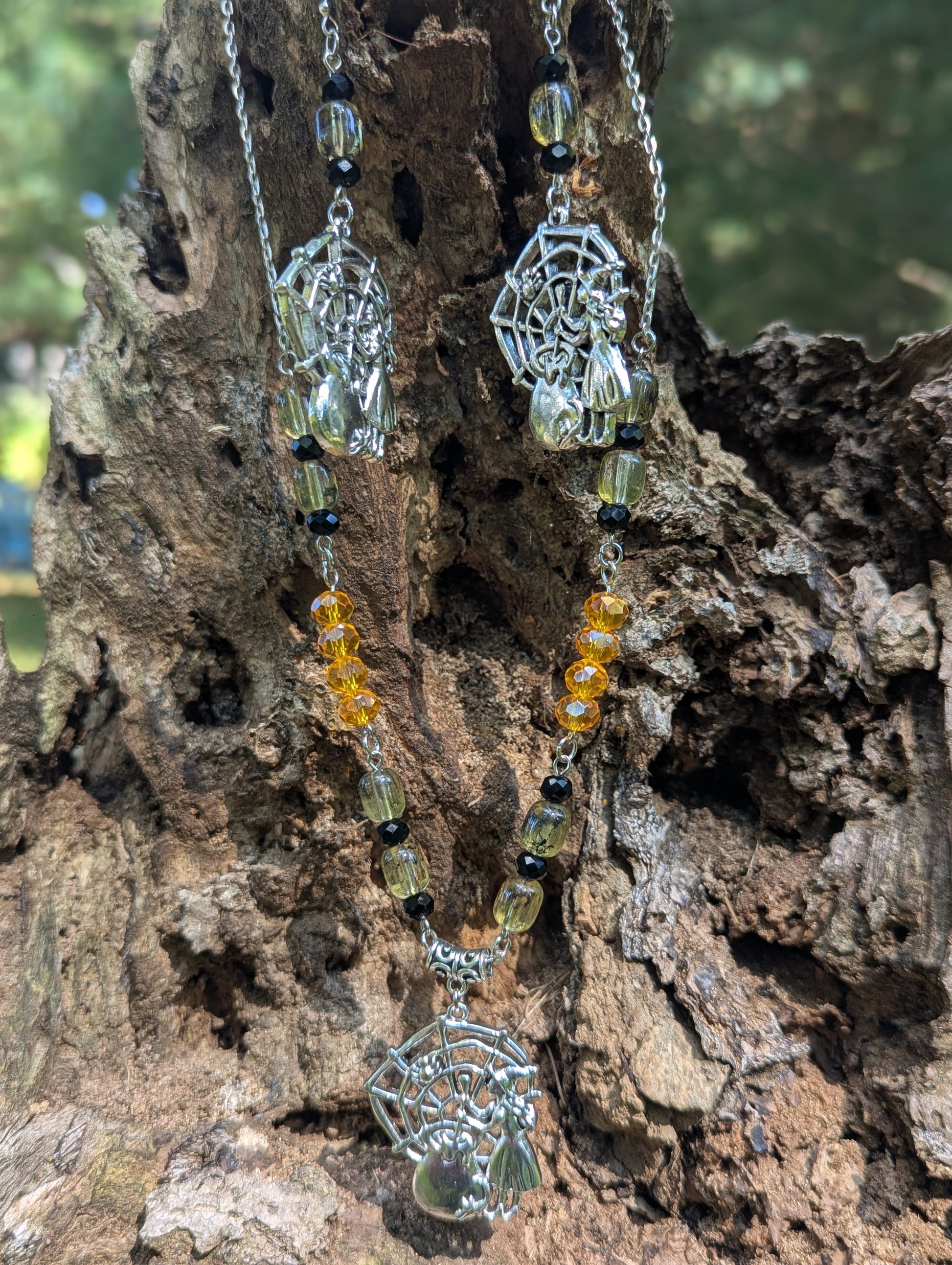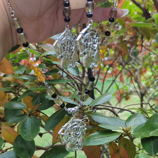 Enchanting and whimsical, the Web of Spells Set brings Halloween magic to life with a matching necklace and earrings. Featuring intricate silver charms of a witch weaving her web beside a bubbling cauldron, this set tells a story of mystery and spellcraft. Warm amber and smoky beads shimmer like candlelight against the night, accented with faceted black crystals for a touch of gothic charm.