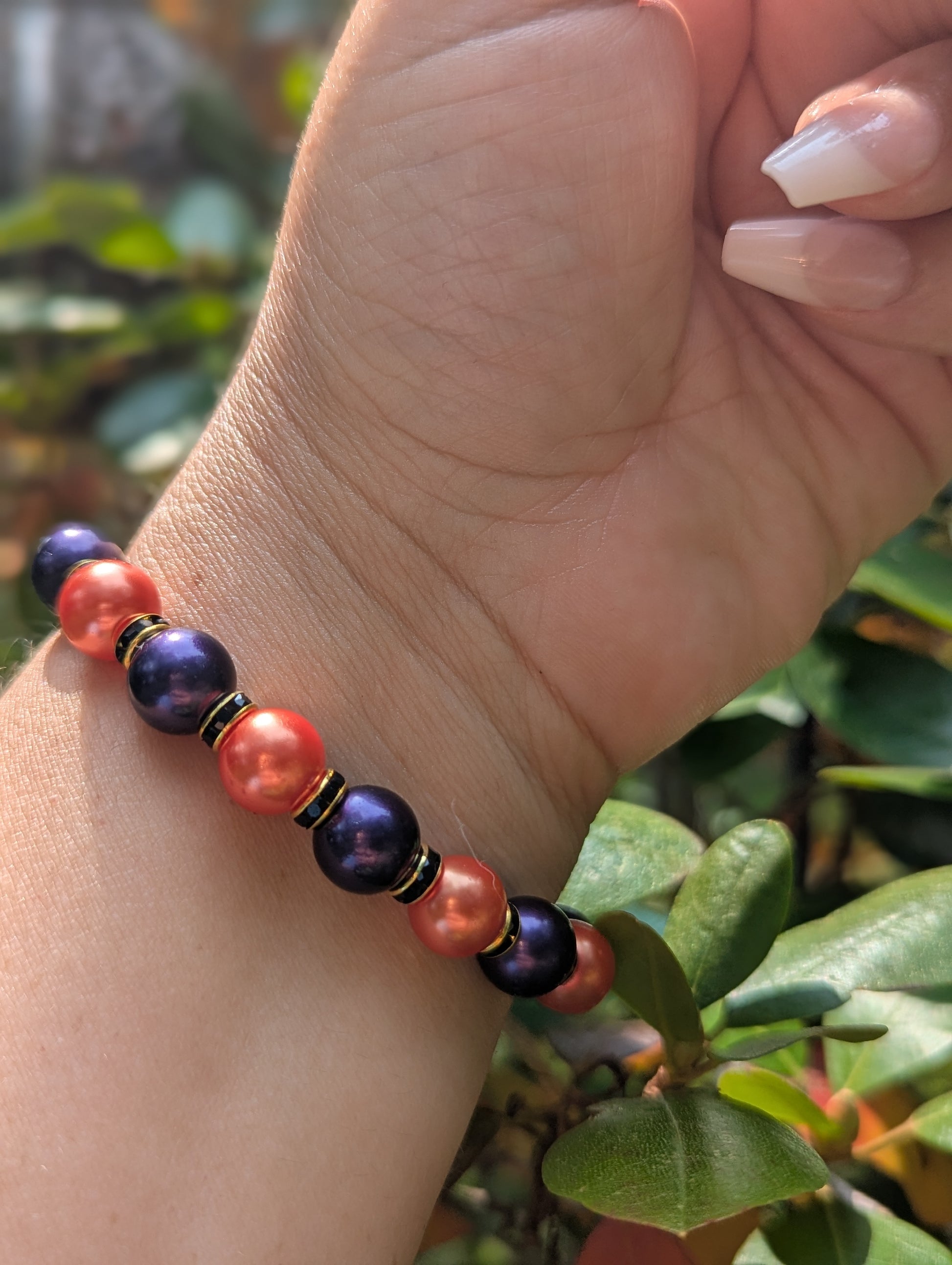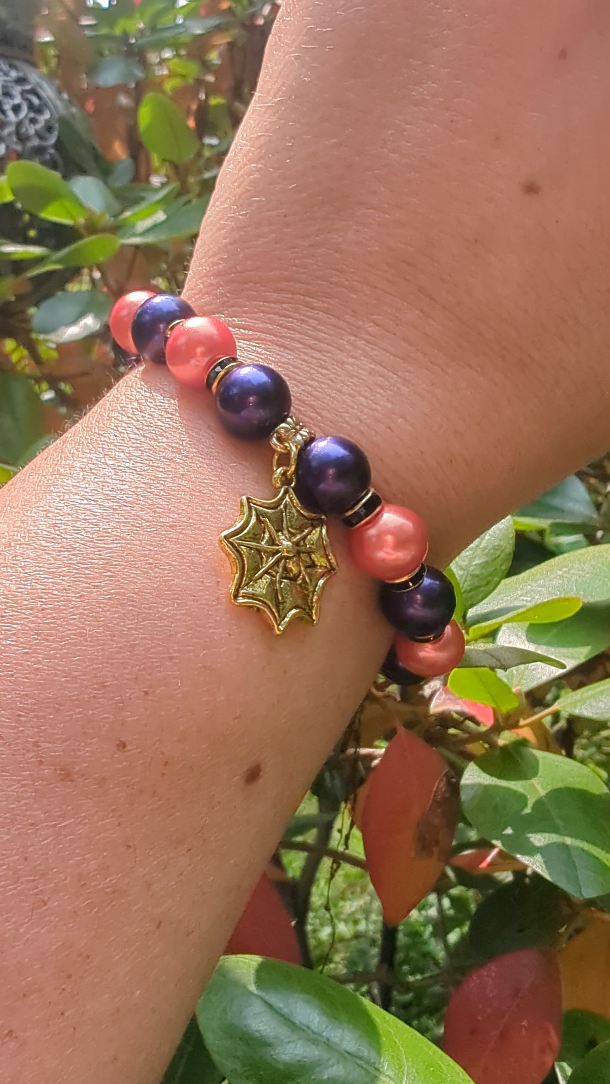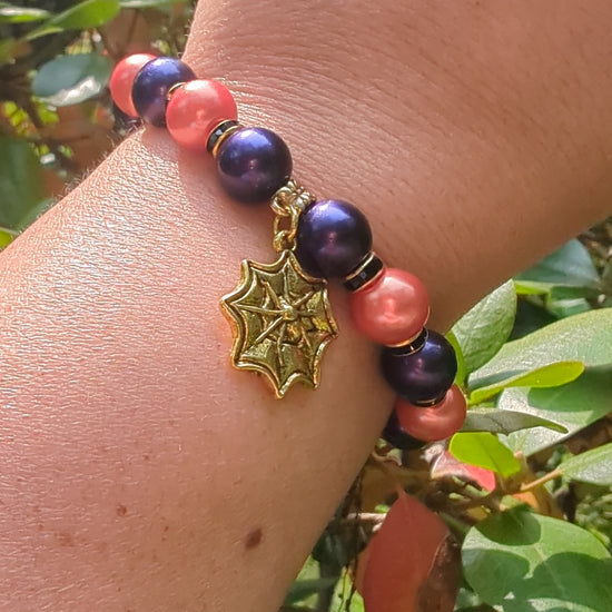 Bring a touch of spooky elegance to your look with the Wicked Web bracelet. Featuring a bold mix of glossy orange and deep purple beads accented with black and gold spacers, this piece captures the magic of the season. A golden spiderweb charm completes the design, making it the perfect accessory for Halloween festivities or anyone who loves a little dark sparkle all year long.